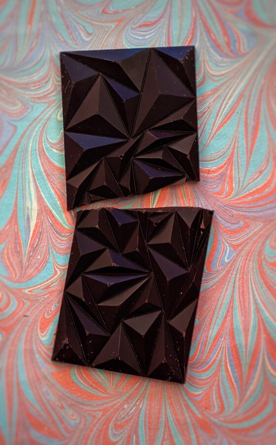 This chocolate craft contains Stevia as sweetener. It gives a licorice note to the chocolate. Is rather surprising that such hight percentage has a smooth mouthfeel and a pleasent armoma bouquet of almond, dry toasted fruit and cinchona. this chocolate tablet is for expert, complex flavor notes only.